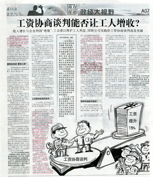 7月14日,《南方日报》以《工资协商谈判能否让工人增收?——ky体育(中国)官方网站公司实践的工资协商谈判或是突破》为题,用三分之二大版篇幅报道广州市ky体育(中国)官方网站机械设备制造有限公司实践工资集体协商的成功经验。